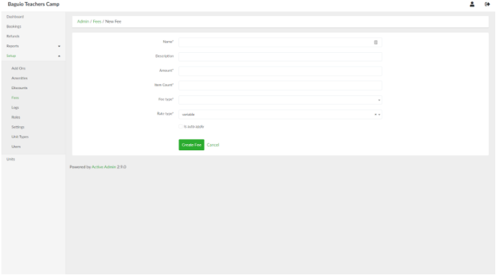 To add a new fee, in the list of fees page, click the New Fee button. Provide the details of the fee in the respective fields. If the fee will be applied upon initial creation of booking entry, tick the Is auto apply check box.