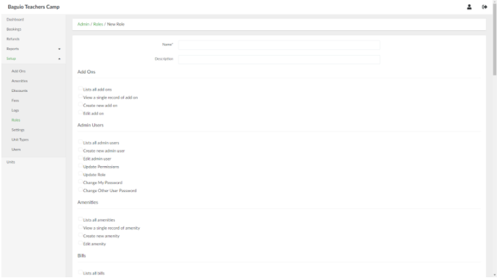 To add a new role, in the list of roles page, click the New Role button. Provide the name and description for the role. For each feature of the system, tick the checkboxes that correspond to actions allowed to the role.