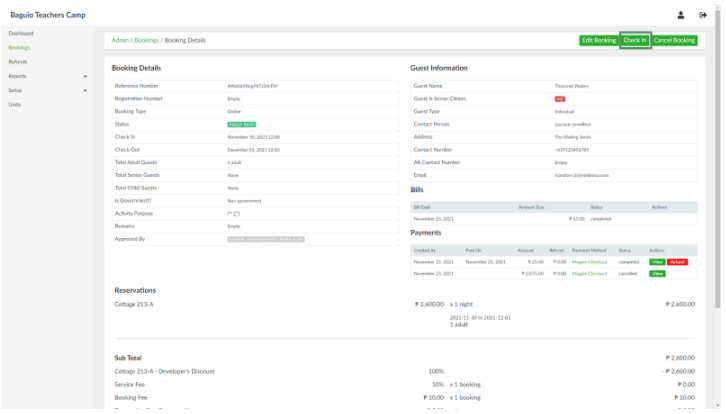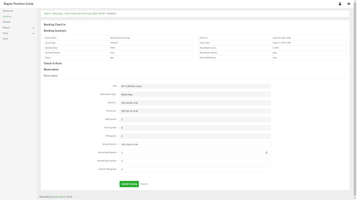 2. Update the fields as needed. When done, click the Update Booking button. This will change the status of the booking from Paid to Checked-In. The check-in details can be updated by clicking the Edit Check-in button.