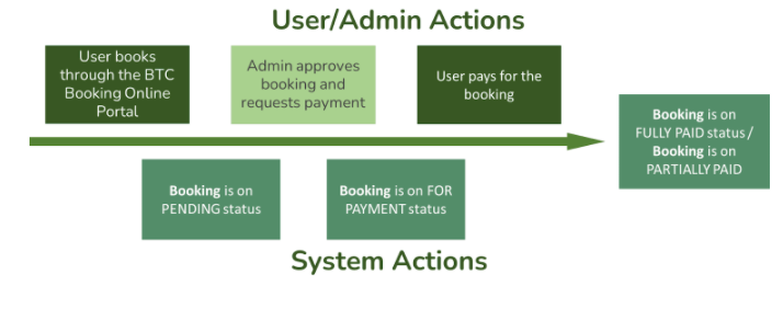 1. The process starts with the user/client booking through the BTC Booking Online Portal. The user/client provides the specifics of the booking and reserves a unit.