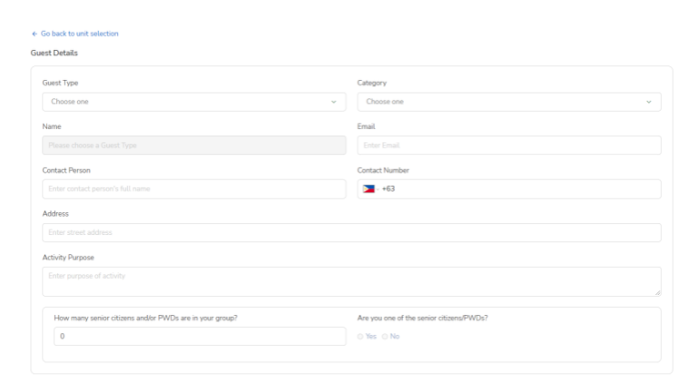 After reserving a unit, the guest is then directed to the booking details page. The booking details page contains a form where the guest needs to provide further details such as the name of the individual or organization who booked the reservation and other necessary fields that are provided.
