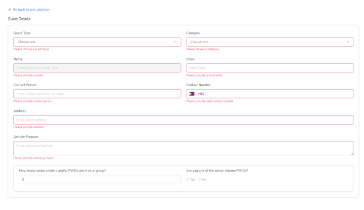 Unfinished fields are highlighted red and guests are required to fill it correctly before continuing. All fields except for the number of senior citizens/PWDs are required.