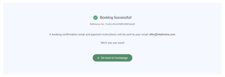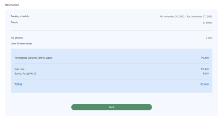 Booking details page also displays a quick summary of the intended booking. To remind the guests of the details of the booking and the units/grounds they want to book before continuing. Clicking the “Book” button will submit the form.