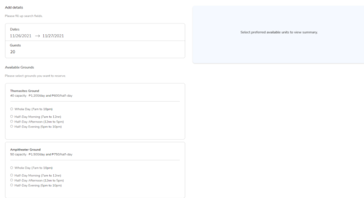 Grounds page allows our guests to directly search and book for grounds unit types. Upon adding search details, available units for reservation within the given details would be displayed in a list.