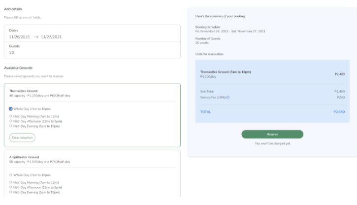 Guests can then select a specific Ground. They also have the option of booking it for the whole day or only a portion of the day. This would display a quick summary including calculated price. Guests can also click the “Clear selection” button from the list to deselect previously selected ground in case they change their mind. Clicking the “Reserve” button would direct the guests to the booking details form.